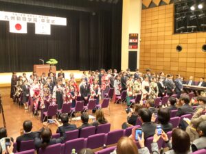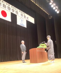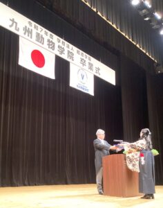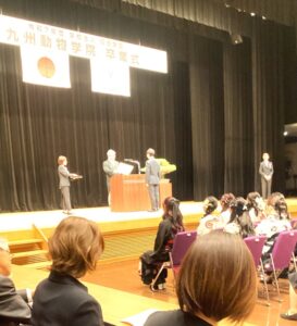 令和7年度卒業式をくまもと森都心プラザ5階のプラザホールで行いました。動物看護学科3年生と動物管理学科2年生の合同卒業式も2回目となりました。天気も快晴で澄み切った空気の中で行われました。大会場での式ならではの心地よい緊張感の中、粛々と式が始まりました。国家斉唱に始まり、卒業証書授与、卒業生表彰、学院長式辞、来賓祝辞、祝電祝詞披露と続き、動物看護学科2年生重松未咲さんが在校生代表送辞を、動物看護学科3年正木満大さんが卒業生代表答辞を述べて式を終えました。式辞の中で德田学院長が「深い井戸に落ちた1匹のロバの話をされました。飼い主の年老いた夫婦は助けることもできず、飢え死にするのを待つのはかわいそうだと、土で埋めてしまおうと考えて土を井戸の中に入れていきました。どころがロバは上から落ちてくる土を振るい落して、それを踏み固めて這い上がり、とうとう助かってしまいました。社会に出るといろいろなことが起こります。負けないでそれを振り落として、たくましく生きて下さい。」とエールを送られました。新たに55名が2年間3年間の歴史をしっかり刻んで成長し、学び舎を巣立って行きました。ひとりひとりが自分の使命を見つけ出し未来の動物業界を背負って、輝いてくれることを教職員一同祈念しております。最後になりましたが、2年間3年間にわたり卒業生を支えていただきました保護者の皆さま、誠におめでとうございます。心よりお祝い申し上げます。また、学院運営に、色々とご理解の上、ご協力いただきましてありがとうございました。頑張れ!九動卒業生!GOOD LUCK!